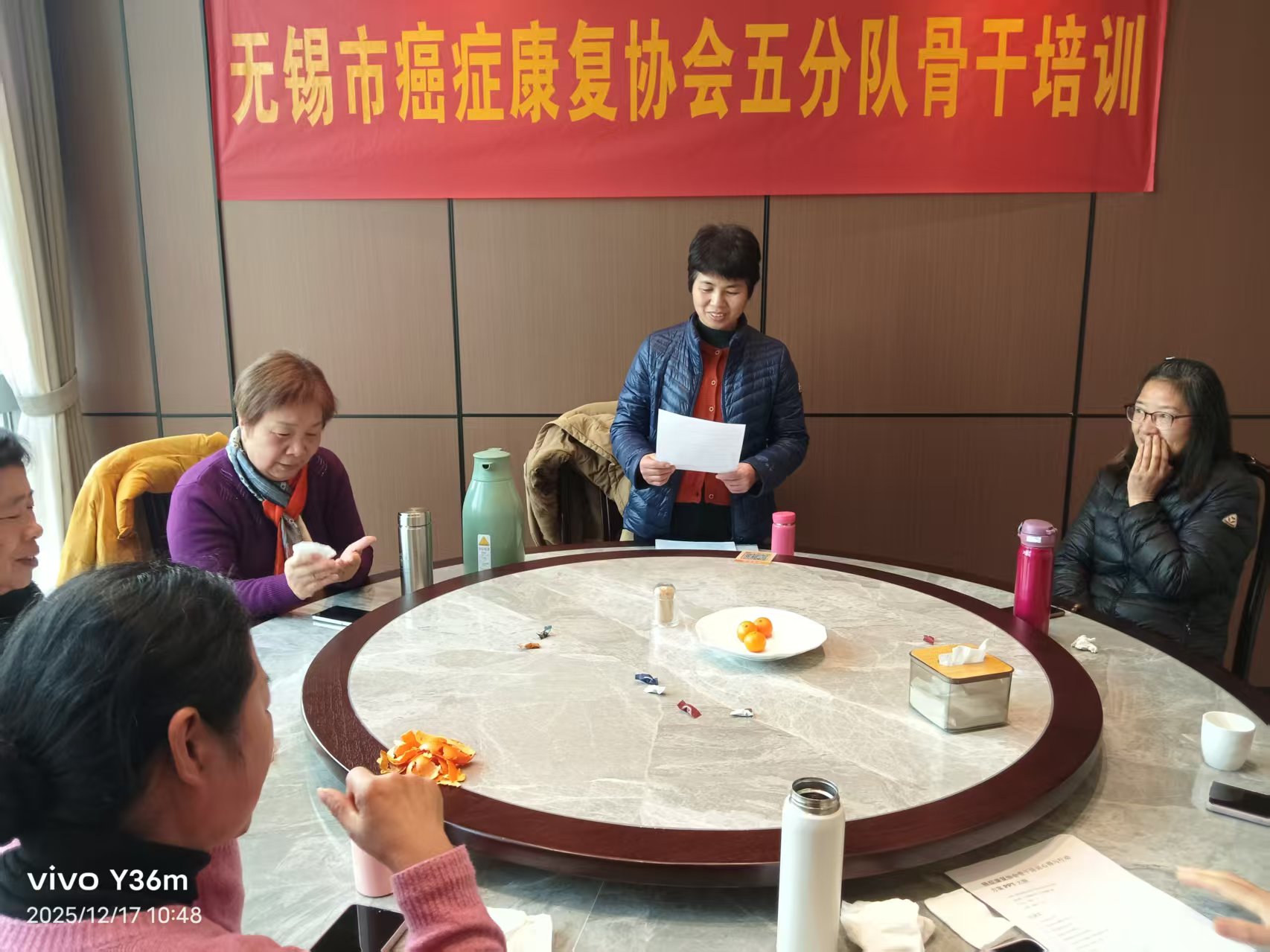 培训伊始,张艳主任首先传达了无锡市癌症康复协会总部为期四天骨干培训的核心内容。涵盖活动方式创新思路、组织架构优化方案、志愿者积极性提升技巧以及会员活动落地策略等多个方面,每一项内容都凝聚着协会对提升会员服务质量的深度考量,为各分队开展志愿服务工作提供了宝贵的“干货”指导,及指明方向。同时,她还带来总部传来的重磅利好消息:协会合作单位将为肿瘤康复者提供VEGF公益免费血液检测服务。这项检测能够帮助会员精准评估康复情况,提前预警肿瘤指标复发风险,张艳主任特别要求全体骨干会后积极宣传推广,确保这项惠及会员的福利落到实处。
