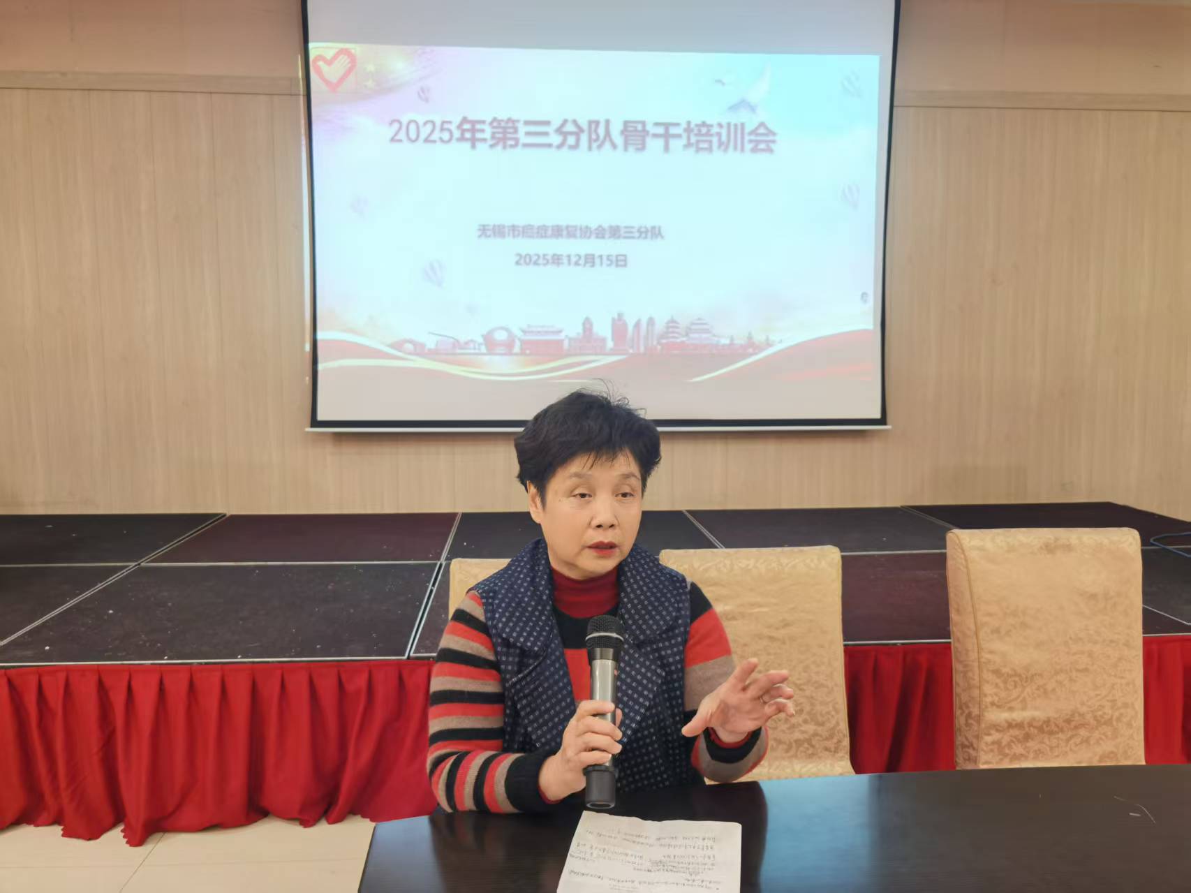 培训会由三分队副主任陶文美主持,分队主任沈良芳率先作2025年工作总结与2026年工作展望。由于众所周知的原因,2025年,三分队面临资金短缺、活动场地受限等巨大压力,分队领导与骨干志愿者凝心聚力、攻坚克难,充分整合社会及社区资源,开展了一系列形式多样、内涵丰富的康复活动:柔乐球运动队坚持日常训练,多次登上协会总部、社区活动等表演舞台;新增桌上冰壶球运动队并跻身市级赛事;舞蹈、掼蛋、茶话会、绿色出游等活动接连落地,全方位丰富会员精神文化生活,让会员在轻松氛围中汲取康复力量,重拾生活自信。